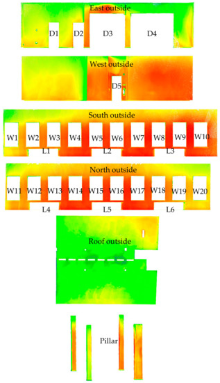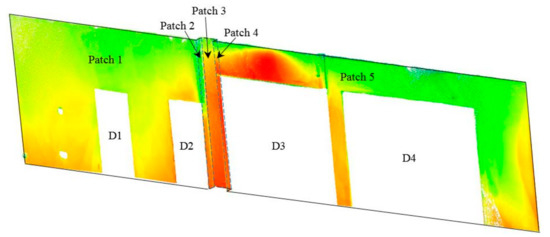 As shown in Figure 8, the global volume is decomposed into five parts which are marked as east, west, south, north, and pillar. The door, window, and lower window features are represented as D1 to D5, W1 to W20, and L1 to L6, respectively. The following fitting process is based on the continuous B-spline surfaces. Consequently, surfaces connected with right-angle interface layer should be subdivided into smaller patches. The east outside wall in Figure 9, which is implemented in the open access software CloudCompare V2.8, is subdivided into five patches by blue dotted layers. The purpose is to guarantee the continuity of every independent patch. As a result, the subdivision is adopted in other parts in Figure 8, which is followed by the same method in Figure 9. The boundary extractions of the window and door features apply the boundary threshold method [6] using the principle of Delaunay triangulation [64,65] with a threshold value of 10 mm. The aim of this extraction is to recognize the boundary features of different surfaces for the future trimming step in the B-spline surface.