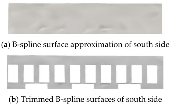 The first B-spline approximation task is based on curves which are of significance to describe different feature boundaries of the structure, for example, windows and doors. The degree value of basis functions is 3 [6,67]. The values of the control point number of different feature boundaries regarding the east side wall in Figure 9 are listed in Table 1. Four feature regions have to be extracted on the east outside surface. Ground-based sides of each feature are ignored. Other sides obtain reasonable numbers of controlled points as is shown in Table 1, which are referred to in detail in [12,63]. The extracted B-spline feature curves are then applied as the trimming and projection boundaries to the B-spline surfaces.