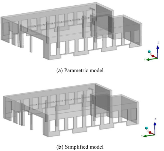 The final reconstructed parametric model and the designed simplified model are shown in Figure 11. The simplified model here is a similar model that keeps the same length, width, height, and thickness as the measured data. It also ensures the same small feature parts, for example, windows, doors, and holes. The most obvious difference is that the parametric model contains the detailed deformed surfaces while the simplified model is constructed with flat surfaces only. Deformed surfaces regarding this building are obtained by the TLS. The description of these deformed surfaces takes advantage of the B-spline approximation to fit the point clouds. The surface features can be found in the dark parts of Figure 10a,b. The detailed analysis regarding the model quality and accuracy is discussed in Section 4.