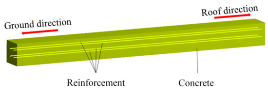 Here, the pillar parts consist of reinforced concrete, as is shown in Figure 12. Hence, the reinforced concrete characteristic [69] is added into the final composite structures based on the parametric and simplified models. The diameter of the reinforcement is 25 mm. One pillar contains four steel bars. The concrete density applied here is. The Young’s modulus and Poisson’s ratio of the concrete are and , respectively. Additionally, the reinforcement is structural steel material, which contains the density of , Young’s modulus of , and Poisson’s ratio of . The reference temperature of the reinforcement is the same as that of the concrete. The properties of the concrete and the reinforcement are listed in detail in Table 2. The reconstructed composite models after compounding the characteristics of the reinforcement and the concrete are finally computed in the ANSYS Workbench software.