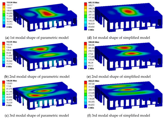 The relative modal data in Table 5 are beneficial for comparing the vibration characteristics of the structural problems [71]. Error 1 calculates the relative deviation regarding the maximum vibration deformation between the parametric and simplified models. Error 2 calculates the relative deviation regarding the modal frequency of two models. Two errors are obvious, which implies the inadequacies of the common simplified model. By contrast, the maximum deformations of the parametric model in the 1st, 2nd, and 3rd modal conditions are far less than those of the simplified model, while the frequencies in the parametric model are higher than in the simplified model. This indicates that the parametric model is more capable in the dynamic computation of structural problems.