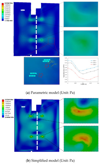The color difference in the deformed zones of the surfaces is obvious. This indicates the stress change. There are two concave strip shapes in the red enlarged area of Figure 16, while the equivalent stress contour of this zone is smooth in the simplified model of Figure 16b. The equivalent stress of the upper concave peak part is 125.24 MPa, while the equivalent stress of the concave valley part is 123.93 MPa. The equivalent stress of the lower concave peak part is 131.99 MPa, while the equivalent stress of the concave valley part is 130.49 MPa. Three line examples are extracted in the same concave change part. The length is about 0.2m which is close to the width of the concave region. The equivalent stress along the line length is listed in this figure. It indicates that the deformed concave shape affects the stress results. By contrast, this detailed feature cannot be found on the flat surface of the simplified model. It indicates that the deformed surfaces have a direct effect on the surface stress behaviors in the loading progress. There is a great difference regarding the maximum equivalent stress between the parametric model and simplified model, which is enlarged as the black dashed frame zones in Figure 16. Two black enlarged zones in the simplified model show that the maximum equivalent stress on the roof surface is close to the maximum value of the global model. However, the maximum stress of the parametric roof surface is far less than the global maximum stress value. The damage behavior in the engineering application will be predicted inaccurately if the parametric model is ignored.