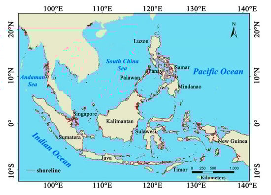 Southeast Asia has a large number of islands, and the Indonesian archipelago is the largest archipelago in the world with more than 17,000 islands []. This area is a hotspot for studying changes in the coastlines of islands, estuary ecological protection, disaster risk management and so on. However, research has concentrated on only a certain sea area, one island or a specific coast. Few studies have focused on all islands of Southeast Asia to reveal coastline changes.