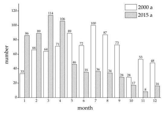 Over the past 15 years, the cumulative total displacements of the island centroids in Southeast Asia were nearly 50,000 m. There were 647 islands with displacements less than 50 m, accounting for 75% of the changed islands, and the number of islands with displacements between 10 and 50 m was the highest at 407. Additionally, the numbers of islands displaced in the 16 directions varied from 40 to 70. The displacements were homologous in all directions, prevailing even in the E direction. Moreover, the cumulative displacements were considerable in the SSE–S and W–NNW directions. In addition, the displacements of island centroid were related to earthquakes that were triggered by the displacement of tectonic plates. For example, the 2004 tsunami that occurred in Indonesia, which caused a considerable area loss on islands located in the Bay of Bengal, and the island centroids also changed synchronously [].