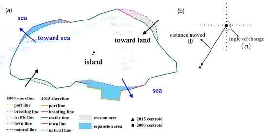 Schematic diagram of coastline change. (a) shows changes in the location and types of coastlines and changes in the island area. (b) shows the change in the centroid of the island.