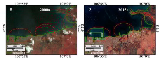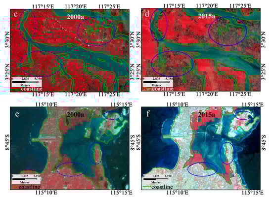 Common incidents included land reclamation, port construction, urban expansion, large-scale deforestation of mangroves and reclamation of coastal wetlands. For instance, significant increases in city areas and harbour coastlines occurred due to the expansion of cities, such as Jayapura, Sorong, and Lobo in New Guinea; large amounts of vegetation along the coasts of Samarinda and Balikpapan in North Kalimantan and East Kalimantan were cleared to develop aquaculture, which resulted in considerable increases in aquaculture dikes. Therefore, we present some remote sensing images from the two years on parts of coasts in Figure 5 to illustrate the traces of human activities.