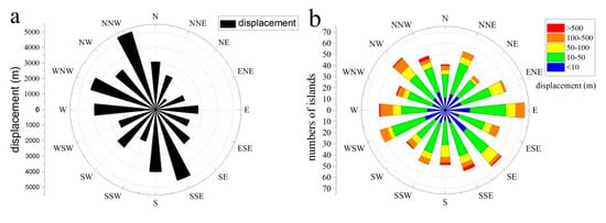 As noted in Section 2.6.3 (3), a rose diagram is shown in Figure 7. In addition, to describe the migration of islands clearly according to the migration distance of the centroid, 10, 50, 100 and 500 m were selected as thresholds, and the displacements were divided into five levels: slight movement, weak movement, moderate movement, strong movement and extremely strong movement.