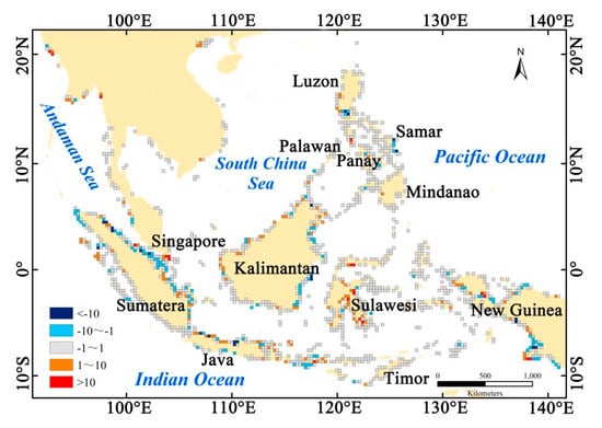 As shown in Figure 3a, areas changed by coastlines expanding seaward were defined as expansion regions; conversely, areas changed by coastlines receding landward were defined as erosion regions. The land–sea patterns of islands seemed to change with the location of the coastline. Therefore, to obtain a better spatial visualisation and to describe the characteristics of land–sea pattern changes quantitatively in Southeast Asian islands, a 30 × 30 km cell was generated to calculate the changed area within each cell. Then, we defined the changed areas whose absolute values were within 1 km2 as stable areas, those within 1–10 km2 as micro-expansion areas (negative values represented micro-erosion areas), and those exceeding 10 km2 as strong expansion areas (negative values represented strong erosion areas). The results are shown in the first figure in Section 3.3.