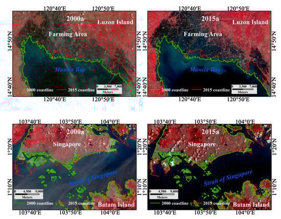 Previous studies have confirmed that different types of coastlines can be extracted well from Landsat images [,,]. However, similar texture or colour characteristics may be exhibited in the images by different types of coastlines, such as salt and aquaculture dikes and sandy and silty coastlines. Thus, extracting the real position of the coastline is difficult in some local regions with complicated geographic features. Therefore, high-resolution images provided by Google Earth and several global scale land-use datasets [,,,] were used for reference to improve the accuracy of locations and types of coastlines. In addition, considering that mangroves are important biological resources and are widely distributed in Southeast Asia, the dataset of the global distribution of mangroves [], derived from approximately 1000 scenes of Landsat images, was also applied as auxiliary data to identify mangrove forests.
