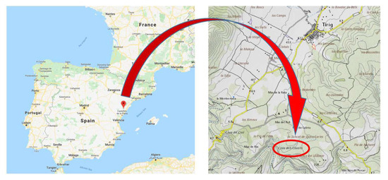 Cova dels Cavalls (“The cave of horses”) is one of the most singular rock art archaeological sites of the Mediterranean Basin on the Iberian Peninsula. It is part of the Valltorta complex, located in Tírig, Castellón, in eastern Spain (Figure 1). This cave is one of the set of rock art sites inscribed in the UNESCO World Heritage list since 1998 [34].