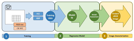 Image-based camera characterization is a well-known procedure described in numerous references [18,19,20,21,41]. The main stages of the imaged-based camera characterization procedure are (1) Training: sets the training data for model learning, (2) Regression model fitting and checking, and (3) Image characterization: creates the output sRGB image (Figure 3). In the following subsections, we provide detailed descriptions of each step.