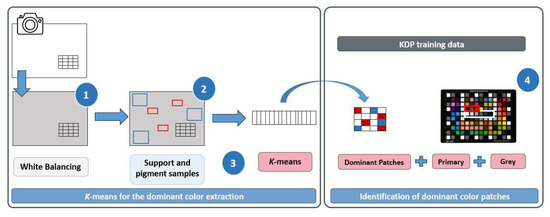 The main steps in P-ASK framework (Figure 4) are: (1) create a white balanced image (D65 illuminant), (2) select support and pigment samples, (3) extract K-means dominant colors, and (4) identify dominant color patches. Further detailed explanations about those steps are given in the subsections below.