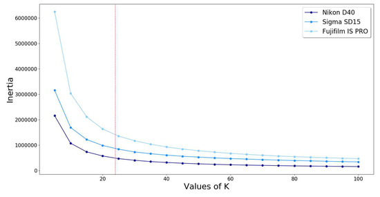 In this study, we developed a Python script to apply the K-means algorithm to our specific problem, which is to select dominant colors in camera characterization. The Python script leverages the Scikit-learn package (v0.21.3) [53] which includes an optimized implementation of the K-means algorithm together with others machine learning algorithms for supervised and unsupervised classification applications [53,54]. Particularly, we used the KMeans function (see [55] for more details).