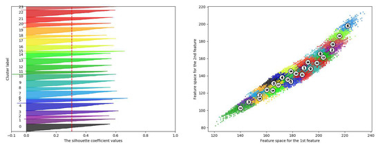 We run the Silhouette analysis using the Scikit-learn module which implements the method in two functions called metrics.silhouette_score and metrics.silhouette_samples. Both functions require the output of the KMeans function as input parameter [70]. Figure 7 displays the graphic results given by the Silhouette method for the Fujifim IS PRO image with K = 24. All silhouette coefficients are similar (around 0.6) with narrow fluctuations, which is an indicator of good clustering for the chosen number of clusters K [71]. Furthermore, all coefficients are above the average silhouette score (vertical red dashed line in Figure 7) which confirms the value 24 as a proper choice for clustering. The silhouette method also provides a graph for visualizing the clustered data (Figure 7b), which shows a very dense, but well separated, data set as expected in our case study.