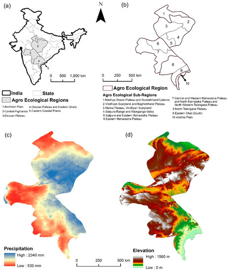 The study area comprises of ten sub-regions within five agro-ecological regions (AER) covering the Indian states of Uttar Pradesh, Madhya Pradesh, Chhattisgarh, Maharashtra, Andhra Pradesh, and Karnataka (Figure 1) [58]. The study area covers approximately 604,615 km2 and is surrounded by the alluvial Gangetic plains in the north and the Bay of Bengal in the south. It borders the Western Ghats in the west and Chota Nagpur plateau in the east. The region is mostly undulating with the elevation ranging between 0–1560 m (Figure 1).