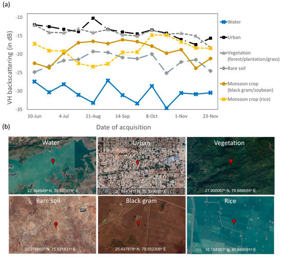 Temporal backscattering profiles were obtained using C-band VH polarization S1 imagery from monsoon crops (rice and black gram/soybean), bare soil, urban, water and vegetation (forest/plantation/grass) features shown in Figure 3a, similar to what obtained by Singha et al. [31]. The backscattering profiles were generated by taking the mean of 10 sample points for each class spread across the study area. The sample points for each class along with their geolocations are shown in Figure 3b.