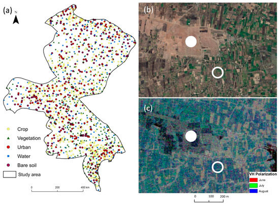 (a) Spatial distribution of training and testing points across the agro-ecological regions (AER). The five land use/cover classes used for this study are vegetation (forest/plantation/grass), urban, water, bare soil, and monsoon crop; (b) Representative reference points on the high resolution google earth imagery for monsoon crop (white hollow circle) and bare soil (white solid circle); (c) The same representative reference points as shown in (b) confirmed using Sentinel-1 monthly median false color composite imagery (red—June, green—July, and blue—August).