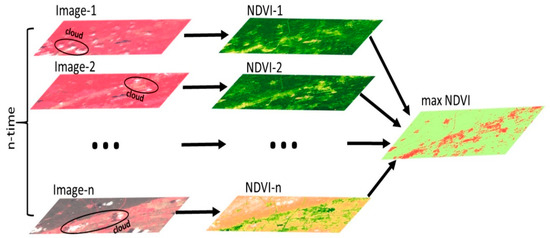 The Normalized Difference Vegetation Index (NDVI) is a widely used remote sensing measure to assess the health of the vegetation and to differentiate crops, and other vegetation (forest, plantation, grass) from bare soil, water and urban [79]. NDVI is a unitless measure and ranges between −1 and 1. Healthy vegetation typically has higher NDVI values compared to non-vegetated surfaces. For calculating NDVI, we require the red and near-infrared (NIR) reflectance bands (Equation (1)):
