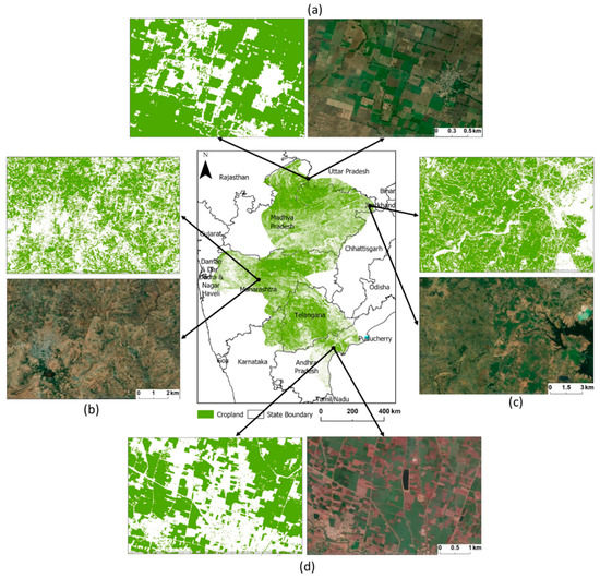 Zoom-in view of the monsoon cropland map generated from the combination of S1+S2 for the agro-ecological regions (AER) at various scales and its comparison with high resolution imagery: (a) Northern Plain (AER-1); (b) Deccan plateau (AER-3); (c) Central Highlands (AER-2); and (d) Deccan Plateau, Eastern Ghats and Eastern coastal plains (AER-4 and 5).