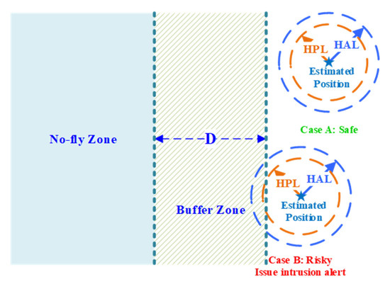 The determination of can be an important reference when we designate the buffer zone (see Figure 2), while the navigation system integrity is available, i.e., , the circle with the estimated UAV position at the center and the radius of should be outside of the buffer zone. Once the circle overlaps the buffer zone, a risky event happens, and an intrusion alert must be issued at once. We can conclude that the minimum width of buffer zone should be the value of in case of intrusion into a no-fly zone.