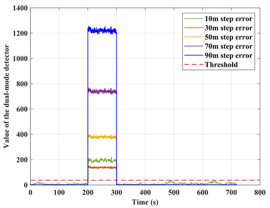 Value of dual-mode detector for step error detection with error ranges from 10–90 m added at an interval of 20 m during 200 s–300 s.