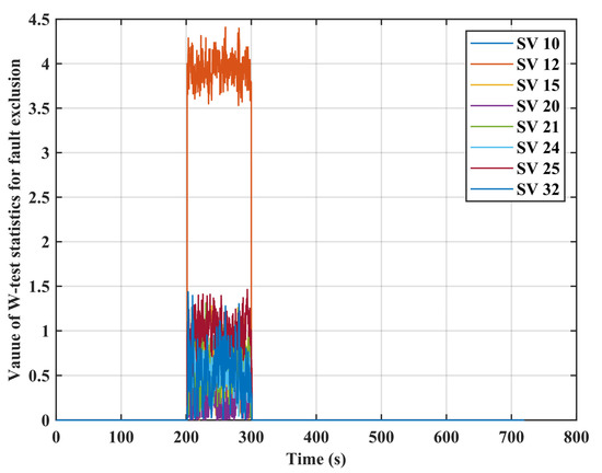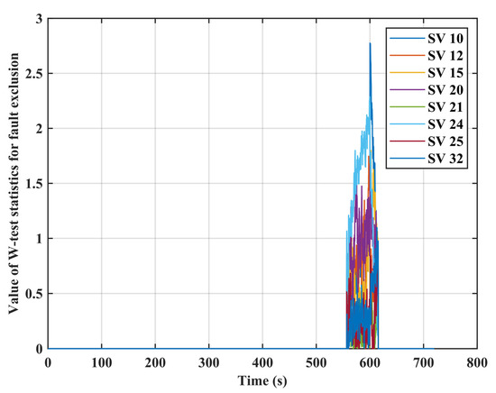 In scenario 2, with the 0.1~0.5 m/s clock drift equivalent range error added to SV10 at an interval of 0.1 m/s, the performance statistics of the detector is shown in Figure 9, and the detection time performance of the dual-mode detector for the ramp error detection is shown in Table 5. It is shown that the errors can be detected by the designed algorithm, and the detection time for the ramp errors varies with the value of the error sources. The larger errors are detected earlier, e.g., the detection time is 11.1 s for the 0.5 m/s errors, while it is 60.3 s for the 0.1 m/s errors. The 0.2 m/s ramp error added to SV 10 during 500 s–600 s is effectively identified and excluded (see Figure 10). However, although the 0.1 m/s ramp error could be detected within 60.3 s, it is not be excluded by our algorithm, see Figure 11. This implies that, with the 0.1 m/s ramp error added, the intercorrelation between the w-test statistics increased and thus invalidated the fault exclusion ability of W-test statistics.