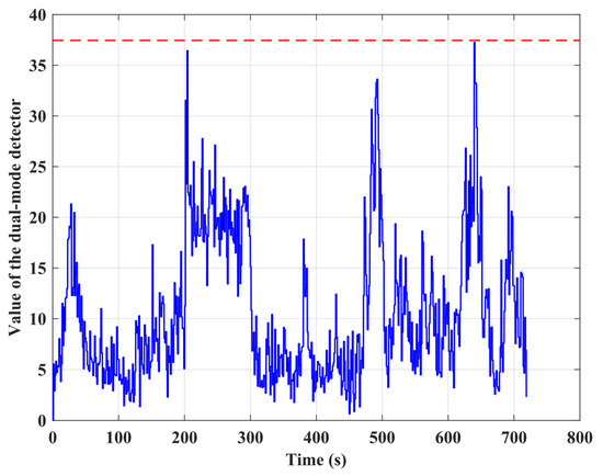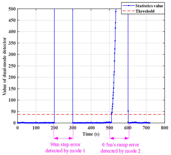 From the results of the sensitivity analysis, we combined two scenarios to design a typical test with both type of errors, in which a step error of 90 m was added to SV32 during 200–300 s, and a ramp error of 0.5 m/s was added to SV20 during 500–600 s. The reaction of the dual-mode detector to the errors is depicted in Figure 13. The step error added at 200 s was detected at 200.1 s, and the ramp error added at 500 s was detected at 511.1 s. Positioning results performance before and after FDE are illustrated in Figure 14. This validates that our algorithm is efficient in detecting and excluding step and ramp errors and therefore, provides the required accuracy for the UAV no-fly zone management. The corresponding positioning accuracy after FDE is analyzed in Table 6. The 95% percentile accuracies with FDE for the horizontal and the vertical are 2.943 m and 4.845 m, respectively, which are within 5 m and 10 m requirements for the UAV no-fly zone management. Therefore, although failure occurred, the navigation system could still meet the accuracy requirements after applying FDE.