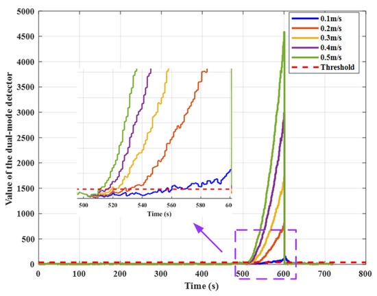 W-test statistics value with 0.1 m/s ramp error added during 500 s–600 s.