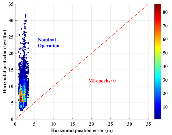The integrity monitoring performance was further analyzed by the Stanford diagram (Figure 15), in which the relationship between and is briefly presented. As shown, during the whole flight mission, the UAV navigation system was in nominal operation with neither integrity risk arising nor integrity hole appearing. The calculated real-time s, overbound s. Additionally, the maximum is still within 35 m, within a predefined of 50 m (Section 3.4). Hence, the integrity requirements determined in Section 3.4 are satisfied. The results indicate that the algorithm proposed is capable of delivering the accuracy and the integrity requirements for UAV no-fly zone management.