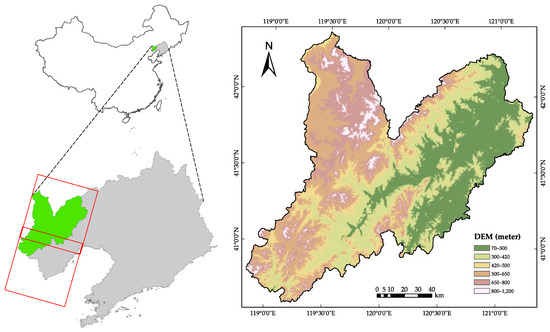 To evaluate the performance of UNVI time series for vegetation discrimination, we conducted our study using data of Chaoyang prefecture-level city, located in the west of Liaoning province, Northeast China (Figure 1). The prefecture spans about 165 kilometers from west to east (118°50′ E to 121°17′ E), and 216 kilometers from south to north (40°25′ N to 42°22′ N), covering an area of 19,736 km2. The terrain is characterized by hills and low mountains, and the altitude ranges from 70 m to 1256 m. The elevations are high in the north, northwest and southwest, and much lower toward the east, shaped like a dustpan that opens to the east (Figure 1). Chaoyang prefecture has a monsoon-influenced semi-arid and semi-humid continental climate, with humid, muggy summers and cold, windy, dry winters, and annual temperature averaged at 8.5 °C. The average annual precipitation is about 450–500 mm, and over half of the annual rainfall is concentrated in summer from July to August. This area possesses a wide variety of vegetation types, including crops, broadleaf deciduous forests, evergreen coniferous forests, deciduous shrubs, orchards, and grass. Different vegetation (e.g., shrubs and grass) may share similar phenological characteristics such as greenup onset date and length of growing season. The vegetation diversity and phenological similarity make Chaoyang prefecture a suitable area for our study.