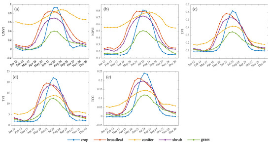 Averaged VI temporal profiles for the five major vegetation types. Panels (a–e) refer to universal normalized vegetation index (UNVI), normalized difference vegetation index (NDVI), enhanced vegetation index (EVI), triangle vegetation index (TVI), and tasseled cap transformation greenness (TCG), respectively.