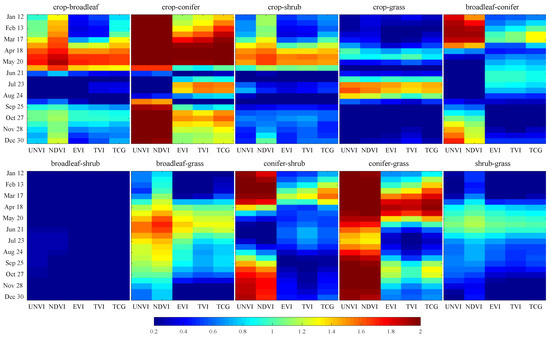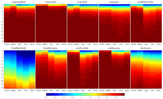 Based on UNVI and the other four VIs (i.e., NDVI, EVI, TVI, TCG), the JM distances between each pair of classes for each single time point were calculated. The results are shown in Figure 5, and the ten subgraphs represent the ten pairwise vegetation combinations. The horizontal and vertical axes represent the vegetation index and the time scale respectively. The color of each grid cell represents the JM distance of the corresponding VI and time. The redder the grid cell is, the higher the corresponding JM distance is and the more separable the two classes become. As we can see from the figure, the pairwise JM distances varied significantly throughout the time due to the phenologically driven differences between the pairwise classes. Crops and conifers were highly distinguishable from any other vegetation. The JM distance between crops and other vegetation (except grass) was large during early spring (late March to late May), because in this period, crops (mainly corn) had yet to be planted, while broadleaf, conifers and shrubs were budding and expending leaves and thus were turning green, so crops can be easily differentiated from those trees. Different from broadleaf, conifers, and shrubs, grass maintained relatively low VI values throughout the growing season, so crops were more separable from grass during the heading period (July to August) when the crops came to the most luxuriant stage. The most remarkable separability between conifers and the other vegetation classes occurred during the cold seasons (from late autumn to early spring), when conifer still remained green while other vegetation had been either dormant or harvested. Broadleaf, shrubs, and grass were the least distinguishable from each other since they shared similar phenological characteristics, all greening up and withering almost at the same time. The only difference between them was the degree of lushness during their growing seasons, which was also why broadleaf and grass were relatively easier to distinguish than other pairs among the three (see the subgraph of “broadleaf-grass”). It is particularly noteworthy that broadleaf and shrub were unable to be distinguished in all time points, since they differed only in the height of the trees (see the descriptions in Table 1).