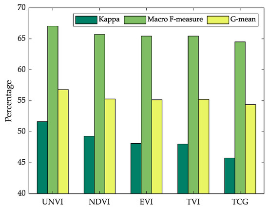 The comparison of averaged kappa coefficients, Macro F-measures, and G-means of the five indices are shown in Figure 7. All the three metrics of UNVI were higher than those of the other VIs, indicating that UNVI had a better classification result for the five vegetation types. Since broadleaf, shrubs, and grass were hard to differentiate, we specifically classified only these three vegetation classes. The purpose of this experiment is to eliminate the influences of crops and conifers on classification and accuracy assessment, and to explore these five indices’ abilities of addressing “intractable problems.” The results are shown in Figure 8. It can be seen that UNVI still outperformed the other four VIs for distinguishing the less distinguishable classes.