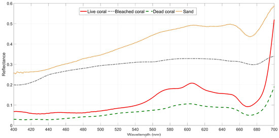 - Hochberg, E.J.; Atkinson, M.J. Capabilities of remote sensors to classify coral, algae, and sand as pure and mixed spectra. Remote Sens. Environ. 2003, 85, 174–189. [Google Scholar] [CrossRef]