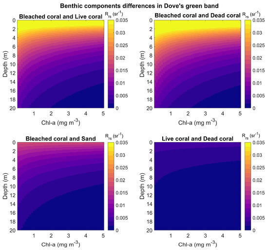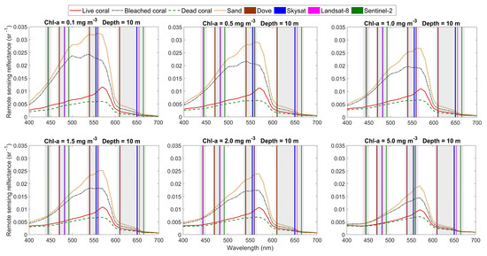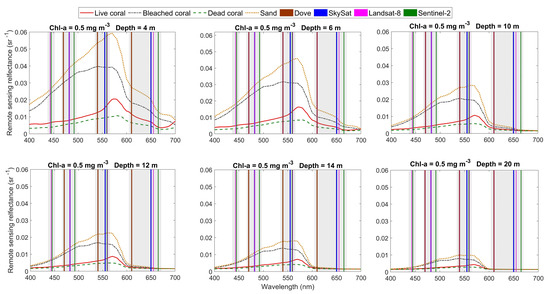 - Hedley, J.D.; Roelfsema, C.; Brando, V.; Giardino, C.; Kutser, T.; Phinn, S.; Mumby, P.J.; Barrilero, O.; Laporte, J.; Koetz, B. Coral reef applications of Sentinel-2: Coverage, characteristics, bathymetry and benthic mapping with comparison to landsat 8. Remote Sens. Environ. 2018, 216, 598–614. [Google Scholar] [CrossRef]
