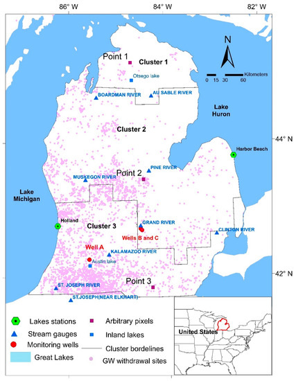 Location map showing the distribution of the three clusters (1, 2, and 3), the Holland and Harbor Beach lake-level measuring stations, stream gauges, lakes Austin and Ostego, three arbitrary pixels (Point 1, Point 2, and Point 3) in clusters 1, 2, and 3, respectively where downscaled GRACETWS and GRACEGWS trends, time series, and uncertainties were estimated, and monitoring wells in Kalamazoo (well A: site name 02S 11W 22CDBB 01) and in Lansing (well B: site name 04N 02W 26BBDB 01 and well C: site name: 04N 02W 16DAAA 01). Inset shows the location of the study area in the USA.