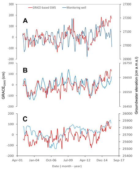Many studies utilizing GRACE data for hydrological research and applications (e.g., [14,15]) target large aquifers and watersheds (areas of 450 × 103 to 6 × 106 km2). However, the majority of the world’s aquifers and watersheds are much smaller; even for the larger ones, one often needs to understand the partitioning of water on the sub-basin level. A finer resolution of GRACE solutions would be a useful tool for tracking the changes in GWS (GRACEGWS) on local scales, especially for regions that do not have sufficient in-situ monitoring sites.