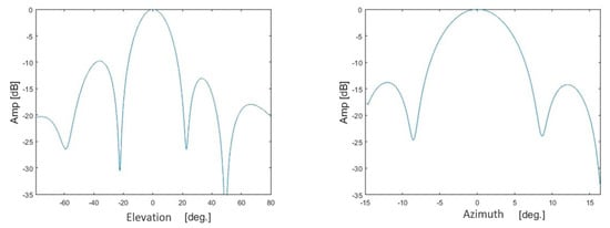 The antenna parameters were measured in the anechoic chamber of the Università degli Studi di Napoli “Parthenope”. They are practically the same for the three antennas. As an example, we report in Figure 1 the elevation and azimuth cuts of the (normalized) radiation pattern relevant to one of the three antennas, namely that with serial number MAA-935985-V. In this case, the measured gain [31] is 24.7 dB; the measured half power beamwidth [31] is equal to 19.2° in elevation and 7.4° in azimuth. When considering the squared pattern (to account for the two-way signal path), these values decrease to 14° and 5.4°, respectively.