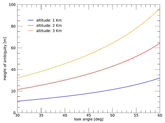 Height of ambiguity of the AXIS system versus the look angle for three different flight altitudes.