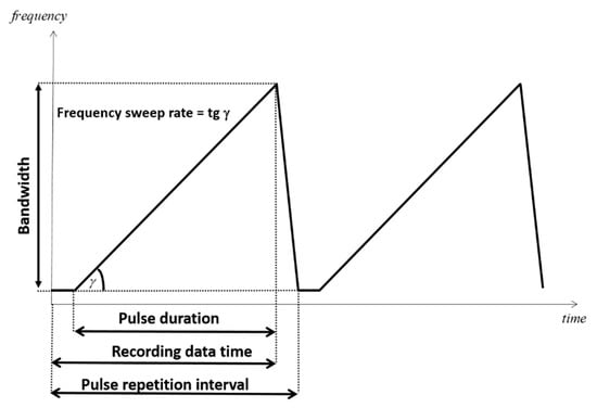 The AXIS radar exploits FMCW technology, which allows for operating in a high-resolution mode though exploiting the comparatively low ADC sampling frequency and low data rate. The main radar parameters are collected in Table 3. Note in particular that, following the notation largely used in the literature [29,30], in the table we have used some terms (Pulse repetition interval, Pulse duration, Pulse repetition frequency) borrowed from pulse radar jargon. The meaning of these terms for FMCW radar is clarified in Figure 4, which shows the temporal behavior of the frequency of the signal continuously transmitted by such kinds of radars. In this regard, note in particular that the pulse repetition frequency is equal to the inverse of the pulse repetition interval. In the specific case of the AXIS system, the recording data time is 605 µs, while the frequency sweep rate, accurately measured following the procedure in [34], is 3.336 × 1011 s−2, which leads to a maximum range distance of about 5615 m recordable by the radar. Moreover, the sampling rate is 25 MHz, while the bandwidth of the transmitted signal is 200 MHz, leading to a slant range resolution of about 0.75 m [30].