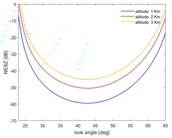 The Noise Equivalent Sigma Zero (NESZ) [29] of the system was computed according to the antenna gain measurements carried out in the laboratory (see previous section) and the radar components’ specifications. The behavior of the NESZ versus the radar look angle is reported in Figure 5 for different flight altitudes.