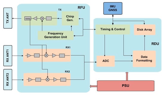 A block diagram of the radar module is shown in Figure 6. As can be seen in the figure, it consists of three main blocks, namely, the Radar Digital Unit (RDU), the Radio Frequency Unit (RFU), which is connected to the three antennas, and the Power Supply Unit (PSU). In particular, the RDU is fully programmable and allows for setting the acquisition parameters, the generation timing, and the data handling. It also includes the ADC and the data storage unit. The RFU includes the frequency generation unit (which generates all the synchronization and radio frequency signals) and the chirp generator unit (which generates the low-frequency modulated chirp signal by means of digital direct synthesis technology). The RFU also includes the power amplifier, the Up/Down converter, and an antenna front-end. The PSU provides the power supply to the whole system by 24–28 V DC internal power. It is completely autonomous and does not affect the aircraft DC bus power. The navigation system is directly connected to the RDU by means of a specific interface; all the navigation data are synchronized with the radar pulses and embedded in the output data. The radar module has a weight of approximately 30 kg (comprising the PSU), and it is accommodated in a rack whose size is about 50 cm × 50 cm × 65 cm. Due to the comparatively low weight and compactness of the radar module, the AXIS system can be mounted on board small aircraft and helicopters. As specified above, the system is currently mounted on board a Cessna 172 aircraft. In particular, the rack that includes the radar module and the navigation system is installed in the aircraft cabin, in place of the two rear passenger seats.