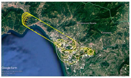 In this section, we present the results relevant to the SAR data acquisition campaign carried out using the AXIS system over the Salerno area, Italy, in April 2018. More specifically, a flight campaign consisting of six overlapping flight circuits was scheduled, each of them containing two antiparallel linear tracks of about 20 km. In other words, we planned to collect SAR data from 12 flight tracks: 6 overlapping tracks from southeast (SE) to northwest (NW) and 6 overlapping tracks from NW to SE. In Figure 7, which shows an optical image of the test area, the actually flown circuits (obtained through the navigation data recorded during the overall campaign) are depicted with yellow lines.