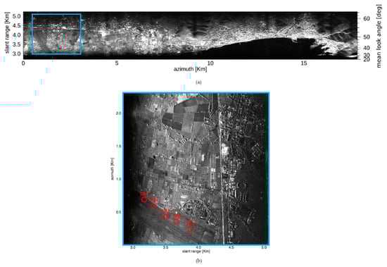 (a) Multi-look amplitude SAR images relevant to the acquired data. A 10 range × 10 azimuth pixel averaging window was applied, obtaining 15 m × 16 m pixel spacing. (b) Multi-look amplitude image of a patch of the entire acquired strip. A 2 range × 10 azimuth pixel averaging window was applied, obtaining 1.5 m × 1.6 m pixel spacing. Red circles indicate the Corner Reflectors’ (CRs’) positions.