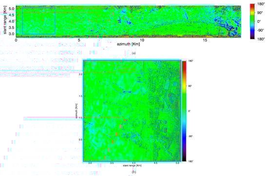 (a) Multi-look interferogram obtained from the single-pass data pair focused with the processing parameters of Figure 9a. A 10 range × 10 azimuth pixel averaging window was applied, obtaining 15 m × 16 m pixel spacing. (b) Multi-look interferogram obtained from the single-pass data pair focused with the processing parameters of Figure 9b. A 2 range × 10 azimuth pixel averaging window was applied, obtaining 1.5 m × 1.6 m pixel spacing.