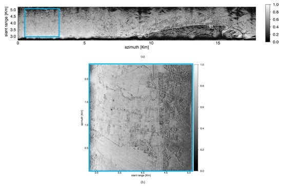 Processing parameters relevant to both images are listed in Table 5. For both images, the output grid coincides with the radar one (range–azimuth). Starting from the single-pass data pair focused with the processing parameters of Figure 9a, we obtained the wrapped interferogram and the corresponding coherence map shown in Figure 10a and Figure 11a, respectively. Note that, as in Figure 9a, a 10 range × 10 azimuth pixel averaging window was applied to generate these two maps. Figure 10b and Figure 11b instead report the interferogram and the corresponding coherence map obtained starting from the single-pass data pair focused with the processing parameters of Figure 9b. As in Figure 9b, a 2 range × 10 azimuth pixel averaging window was applied to generate these two maps. It is stressed that to obtain the interferometric products shown in Figure 10 and Figure 11, besides the averaging window described above, we did not apply any additional filter aimed at limiting the noise effects. It is finally noted that in all the interferograms shown, we removed the topographic component provided by the external SRTM DEM used during the focusing step.