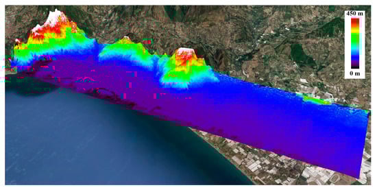 InSAR DEM obtained starting from the low-resolution interferogram considered in Figure 10a. The DEM was geocoded and superimposed over a Google Earth image.