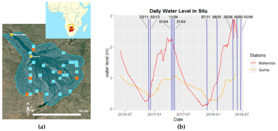 The in-situ water level records measured at two stations, Mohembo (Latitude: −18.275733, Longitude: 21.787312) and Guma (Latitude: −18.96266, Longitude: 22.373213), were retrieved from the Okavango Delta Monitoring & Forecasting service at daily resolution [29]. The missing data were interpolated with the Kriging method in RStudio. The water level records at both gauges in Figure 1b show clear seasonality. As previously discussed, the Delta region receives a low amount of precipitation; thus, the majority of the water supplied to the Delta is largely related to the Okavango River runoff measured at the two inlet stations. Hence, the wet season in the scope of this research is defined as the time of the year at which high water levels occur at both stations in April through June; dry season is when the water level is low at both gauges in November through January.