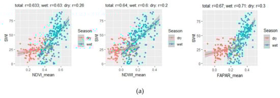 The results indicated in this study align with the conclusion of Torres-Rua et al. (2016) that one single vegetation index, such as NDVI, is insufficient to describe the internal variance of SSM fully; the addition of other vegetation indices (such as LAI) and spatial heterogeneity parameters can provide an improved spatial estimation of SSM [17]. In this study, different characteristics of each investigated VI infer that the heterogeneity in the vitality and evapotranspiration of vegetation, and the photosynthetic primary production capacity over the landscape contribute to the explanation of the SSM patterns underneath. As Figure 2; Figure 3 indicate, the mean values of vegetation characteristics perform best among all statistical descriptors of vegetation conditions in correlating the most strongly with SWI. This result is consistent with Klinke et al.’s (2018) findings [20] and is responsive to the multiscale parameter regionalization (MPR) technique proposed by Samaniego et al. (2010) to downscale coarse resolution parameters with finer resolution input data through upscaling operators like the harmonic mean [23]. Additionally, Klinke et al. (2018) pointed out the long-range and intra-annual variations in SSM [20], and Dabrowska-Zielinska et al. (2018) analyzed the different contributions of vegetation in dry and wet moist conditions of soil on backscattering [22]. Both indicate the seasonal effect in vegetation–soil relations. This idea has been taken up through a dry/wet season observation stratification in this study, whereas a stronger linear correlation between VI and SWI can be found for the wet season observations. However, no obvious differences could be found with respect to dominant vegetation types based on the 2015 PROBA-V Land Cover map of Africa [30]. This may be due to similarities in the reaction of these two dominant savanna vegetation classes. Moreover, this demonstrates that real-time vegetation information demonstrates a stronger capability to estimate SSM while non-real-time vegetation information from past land cover map does not add much information to the estimation of SWI in this study. To further understand how the near real-time vegetation traits are associated with soil moisture condition, long term time series of VIs and time-lagged analysis should be used to interpret when the vegetation is stressed after some accumulation in a plant’s water-limited features over time.