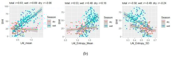 SD and CV measure first-order spatial variation in the four VIs. They are moderately correlated with SWI (Figure 2, Figure 3). CVs are generally negatively correlated to SWI while SDs are positively correlated to SWI. This indicates that spatial variability in the VIs could be meaningful in understanding VIs’ relations with SWI. The texture information, homogeneity, and entropy, correlated weakly to moderately to SWI. These second-order texture measures describe properties of the horizontal vegetation structure through the relationship comparison of directly neighboring pixels. They are mathematically more complex than the first-order statistics discussed above but can reveal particular patterns. In the wet season where foliage is abundant, textural information is more distinct since the original signals are more dynamic. Correlation strength with SWI is, therefore, stronger in comparison to the dry season. In comparing the four selected VIs, textural information for LAI is consistently more relevant in its correlation with SWI.